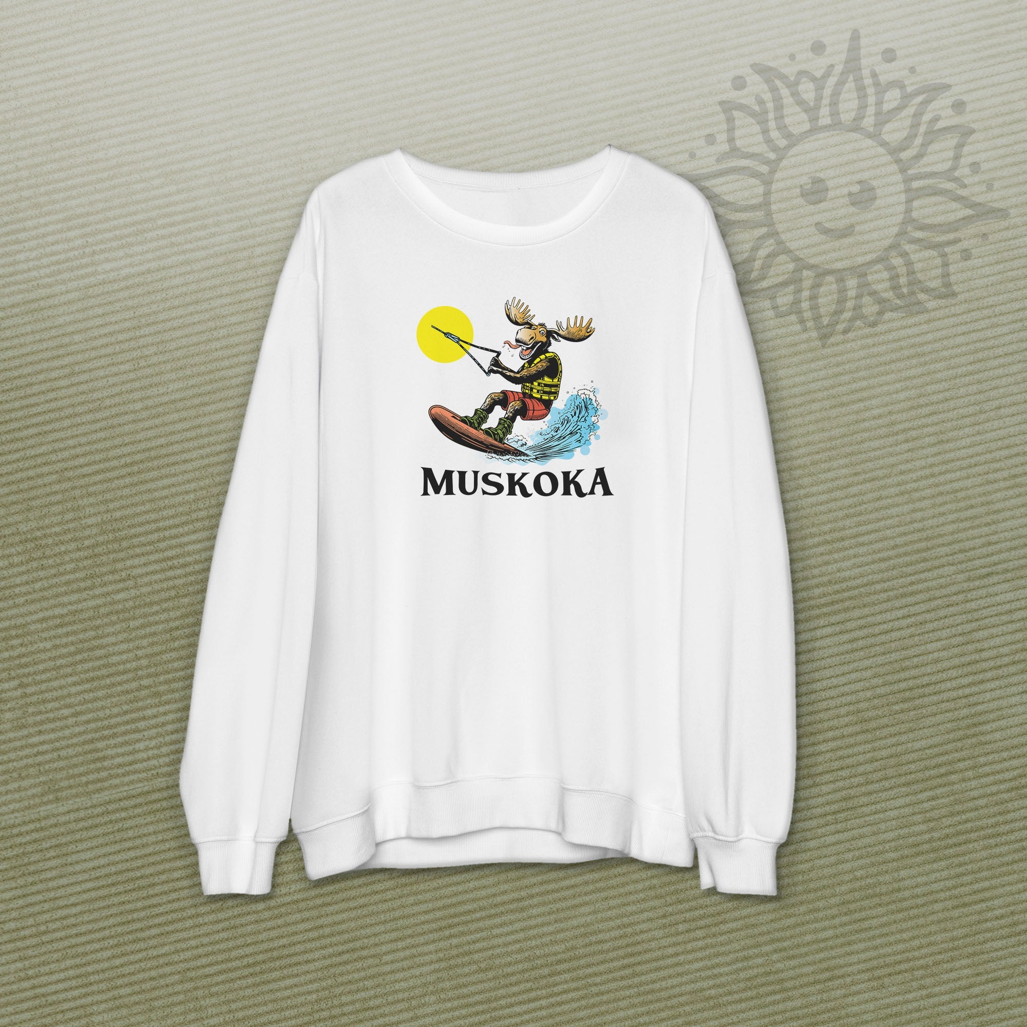 Catch the wave of fun with the Adult Wakeboarding Moose Crew Neck Sweatshirt! Featuring an adventurous moose in a wakeboarding pose, this design is perfect for thrill-seekers who love the water. The sweatshirt’s vibrant colors change in the sunlight, adding a playful touch to your look. Ideal for your next Muskoka adventure or as a spirited addition to your casual wear, this cozy sweatshirt lets you showcase your love for wakeboarding with style!